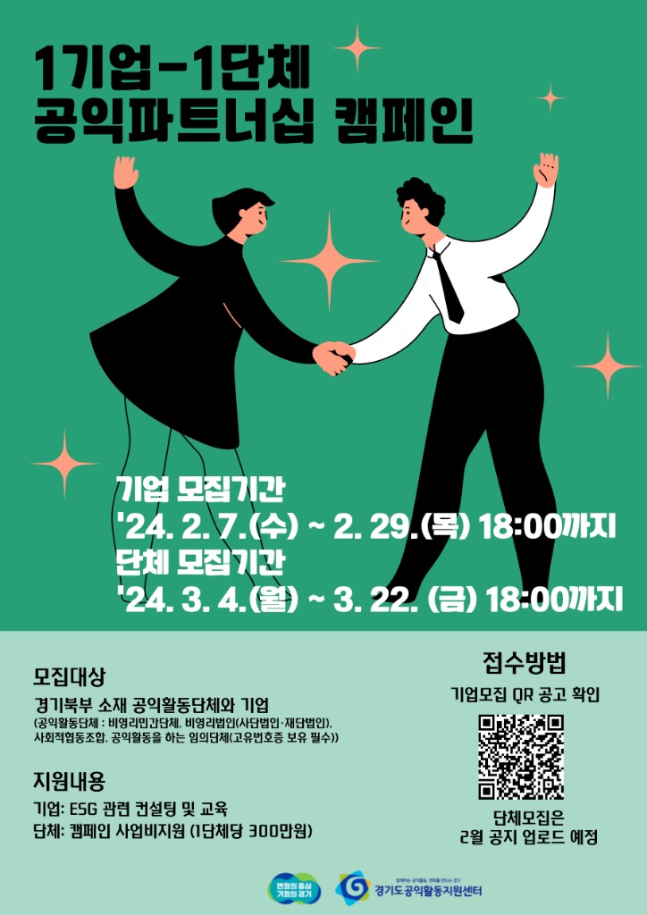 참여 희망 기업은 공익활동지원센터 누리집( www.gggongik.or.kr) 공지 사항에 게시된 신청 서식을 작성해 2월 29일 오후 6시까지 전자우편( [email protected] )으로 접수하면 된다.