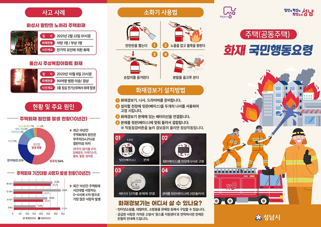 성남시는 화재 발생 시 시민의 생명과 재산을 보호하고 피해를 최소화하기 위해 주택과 아파트 화재 대비 국민행동요령 안내문을 자체 제작해 배포했다고 20 일 밝혔다 .