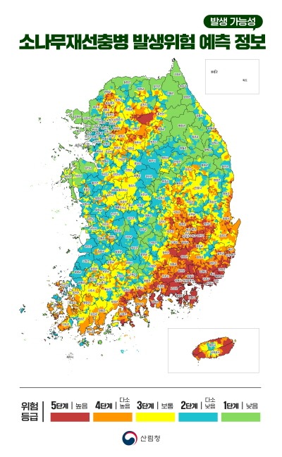 발생위험 예보는 재선충병 발생가능성을 총 5단계로(높음~낮음) 구분해 행정동·리 단위로 매월 제공하며, 지방자치단체는 이를 활용하여 재선충병 피해 확산에 선제적으로 대응할 수 있게 된다.
