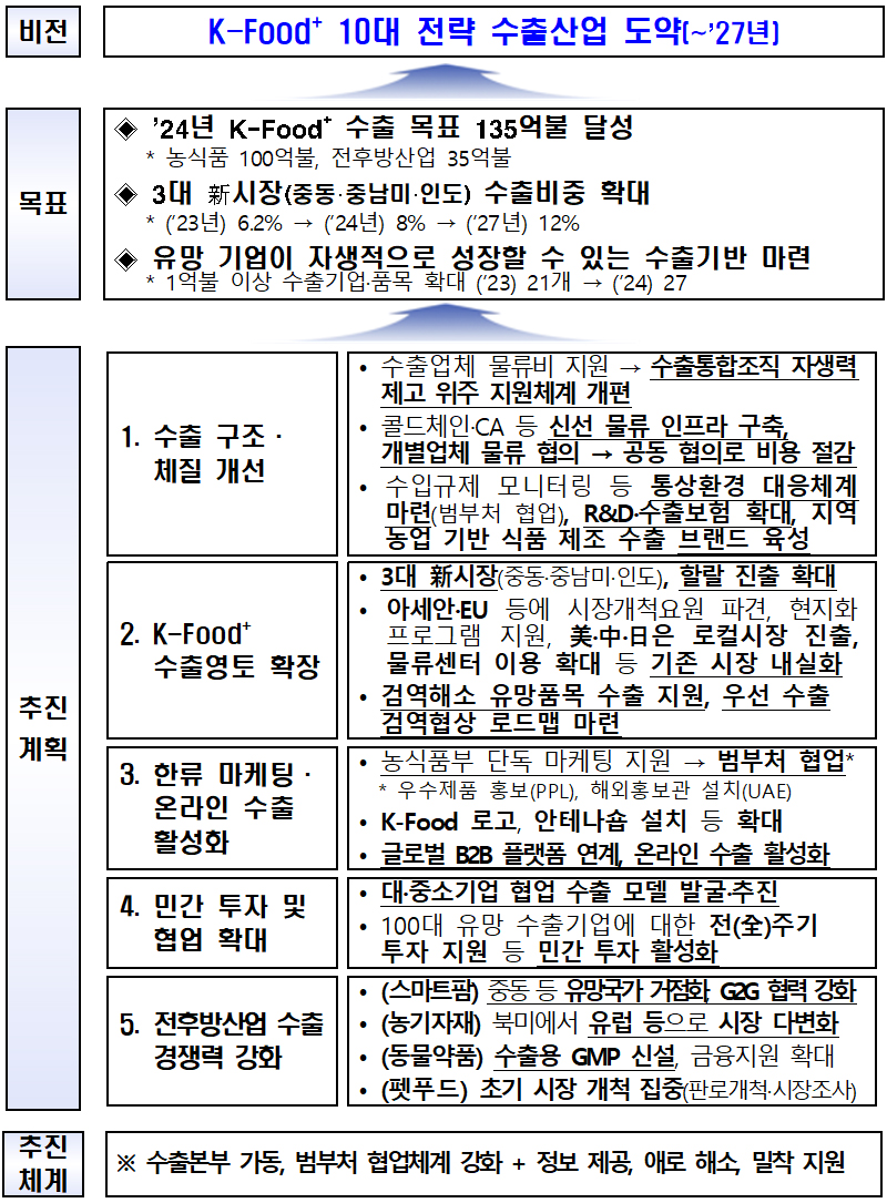 정부가 세계 시장을 선도하는 수출 전략사업으로서의 케이-푸드 플러스(K-Food+) 육성을 위해 수출 구조와 체질을 개선하고 수출 영토를 확장한다.