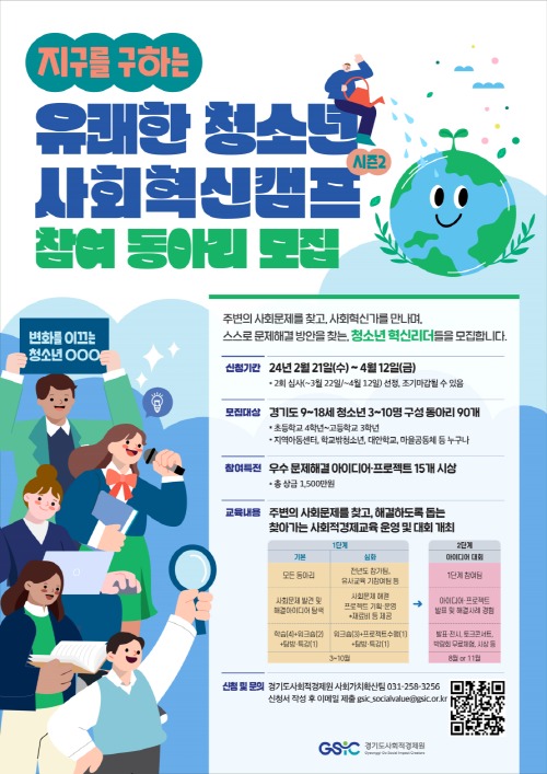 경기도와 경기도사회적경제원이 2월 21일부터 4월 12일까지 청소년 스스로의 힘으로 사회문제를 해결하는 사회적경제교육과정, ‘지구를 구하는 유쾌한 청소년 사회혁신캠프 시즌2’에 참여할 청소년동아리를 모집한다.