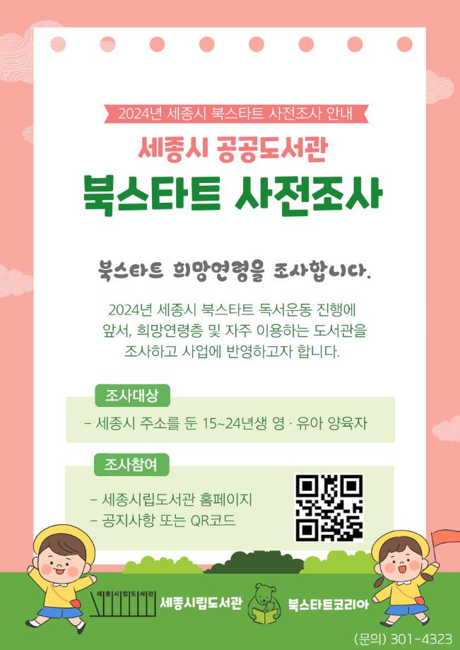 조사대상은 세종시에 주소를 둔 2015~2024년생 영유아 양육자로, 조사는 세종시립도서관 누리집 공지사항 또는 큐알코드를 통해 참여할 수 있다.