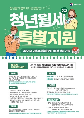 신청 희망자는 오는 26일부터 2025년 2월 25일까지 복지로 홈페이지(www.bokjiro.go.kr) 또는 주소지 관할 주민센터에 방문해 신청할 수 있다. 자세한 내용은 마이홈 콜센터(1600-0777), 이천시 청년아동과(031-645-3692)로 문의하면 안내받을 수 있다.