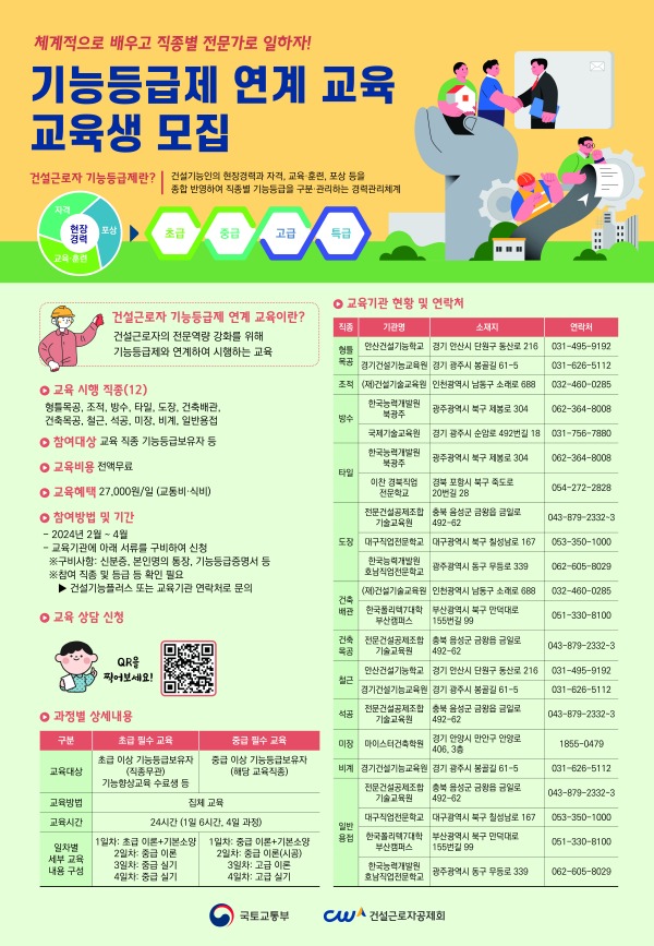 먼저, 건설기능인을 위한 기능등급 연계교육은 건설현장에서 일하는 기능인력의 체계적인 육성을 위해 최초로 시행되고 있는 기능등급별 맞춤 교육으로 건설기능인의 전문성 향상을 위해 국토교통부 주관으로 2022년 최초 실시(6개 직종) 이후, 2023년 12월부터 2배 늘어난 12개 직종으로 확대*하여 시행하고 있다.