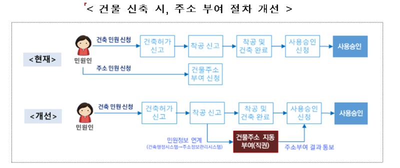 이러한 불편 해소를 위해 건축 담당부서가 착공신고를 접수하면 주소 담당부서에 민원정보가 실시간 통보되고, 업무 담당자가 주소 직권 부여에 즉시 착수하도록 업무절차가 변경된다.
