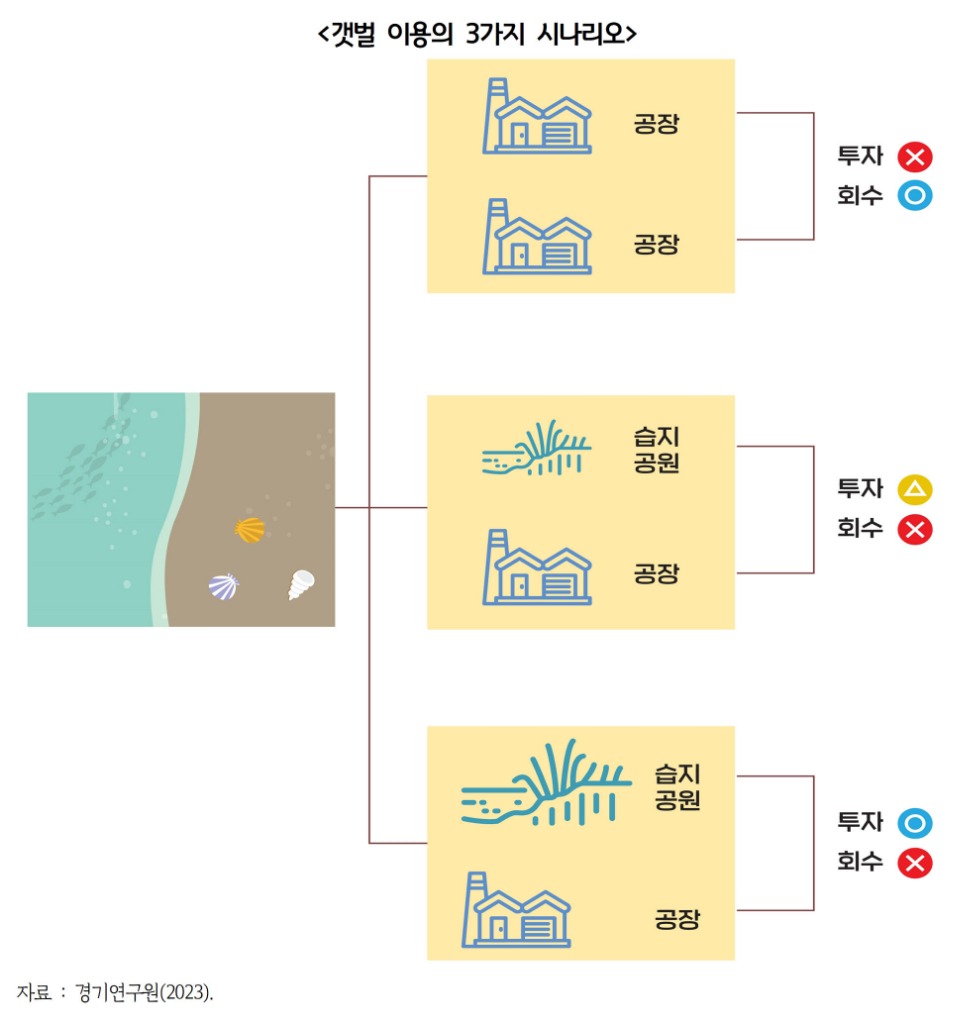 국제사회는 환경사회지배구조(ESG) 착한 투자를 권고하면서 다양한 방식의 돈과 기술을 활용하여 자연 자원의 순손실을 방지하고자 노력하고 있다. 이제부터 경기만의 갯벌을 ESG 관점에서 회피-최소화-복원-상쇄와 같은 대안으로 접근해야 한다는 의견이 나왔다.