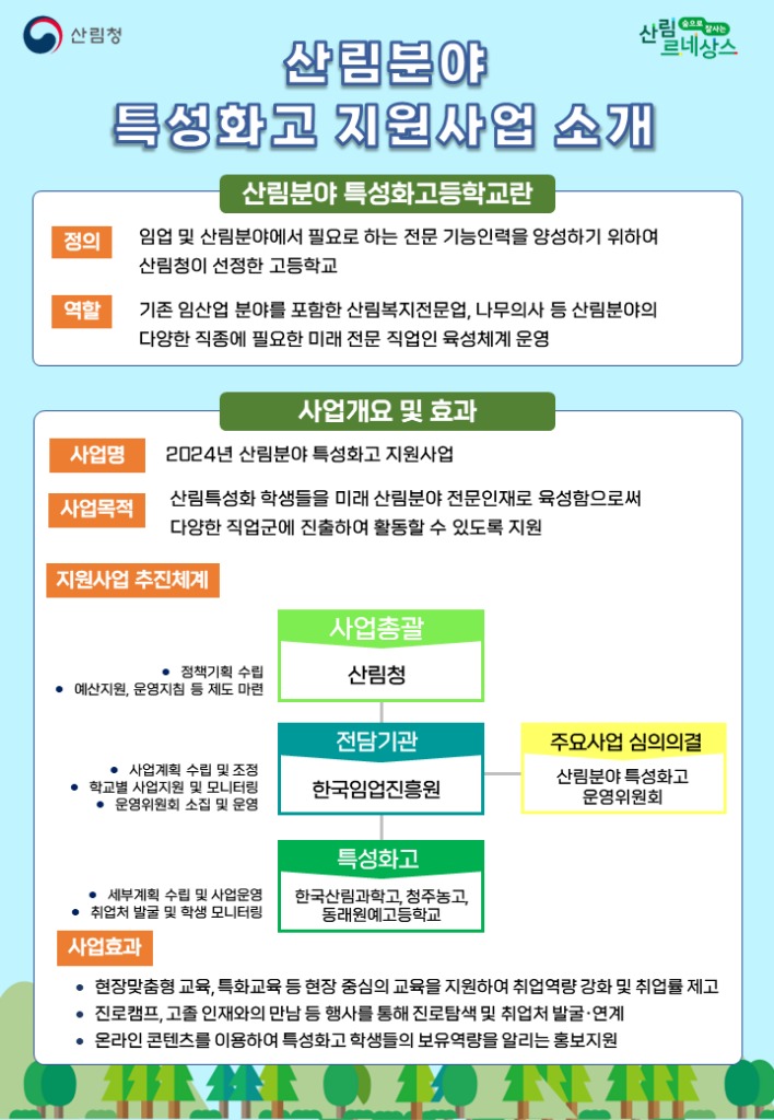 산림분야 특성화고 사업은 목공·임업기계장비 기술과 전문자격증 취득 등 미래 임산업 분야 젊은 인재 양성을 목적으로 추진하고 있으며, 선정된 학교에는 교과과정 개발·운영비, 현장실습비, 연수비, 자격증 취득비 등의 예산을 지원한다.