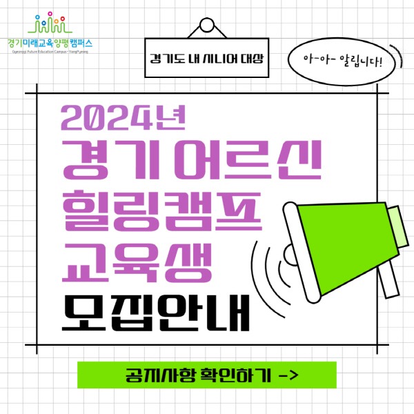 경기도평생교육진흥원 경기미래교육 양평캠퍼스(이하 양평캠퍼스)가 경기도 어르신을 대상으로 4월부터 11월까지 진행되는 ‘2024년 경기 어르신 힐링캠프’ 참가 기관을 선착순으로 모집한다.