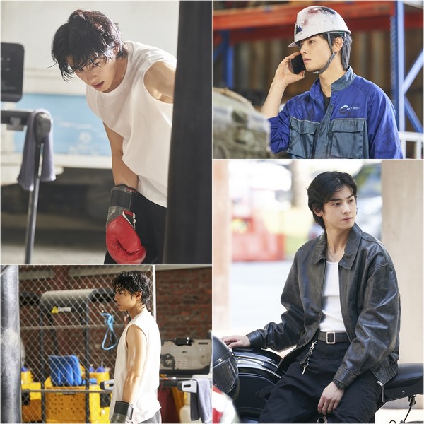 땀으로 범벅이 된 머리카락, 검을 그을음이 잔뜩 묻은 작업복, 무심하게 오토바이에 걸터앉은 모습 등, 처음 만나는 차은우의 거친 모습이 보는 이에게 신선한 매력을 선사한다.