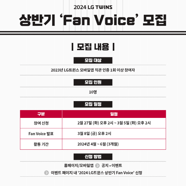 2024 LG트윈스 상반기 ‘Fan Voice’는 2023년 LG트윈스 모바일앱 직관 인증 1회 이상 참여자라면 누구나 지원 가능하다. 모집 인원은 총 10명이며, 지원은 LG트윈스 홈페이지 및 모바일앱의 이벤트 페이지 내 ‘2024 LG트윈스 상반기 Fan Voice’ 신청란을 통해 가능하다. ‘Fan Voice’에 참여하는 팬들에게는 LG트윈스 2024년 어센틱 유광점퍼와 정규시즌 홈경기 초청(블루석 4장/활동 기간 중 1회)를 제공한다.