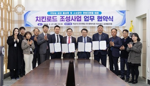 시는 27일 익산시청에서 '치킨로드 조성사업' 추진을 위한 업무협약(MOU)을 체결했다. 이날 협약에는 정현율 익산시장과 정호석 ㈜하림 대표이사, 한원탁 ㈜엔바이콘 대표이사, 김양배 치킨로드 상생협의체 대표가 참석했다.