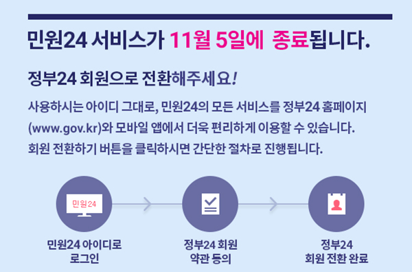 행정안전부는 정부민원포털 ‘민원24(http://www.minwon.go.kr)’가 11월 5일 서비스를 종료하고 ‘정부24(http://www.gov.kr)’로 통합해 서비스를 일원화한다고 밝혔다.