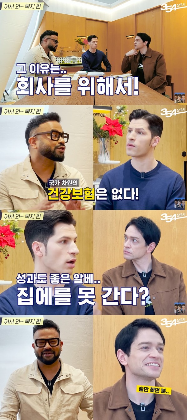 지난 27일 유튜브 채널 ‘354 삼오사’에서는 각국 기업들의 복지 혜택과 관련해 대화를 나누는 럭키, 알베르토 몬디, 다니엘 린데만의 '어서와 이런 복지는 처음이지?' 영상이 공개됐다.