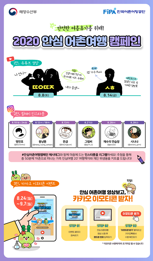 이와 함께 10일을 시작으로 월말까지 명민호, 그림비 등 인기 그림 작가 6인이 참여한 어촌여행 인스타툰을 총 8편 선보인다. 가족·친구·연인과 함께 개인 위생방역 수칙을 지키며 어촌체험휴양마을 여행을 즐기는 모습을 감각적인 그림으로 표현했다. 국민 참여 코너로 인스타툰 리그램 이벤트가 동시에 진행된다.