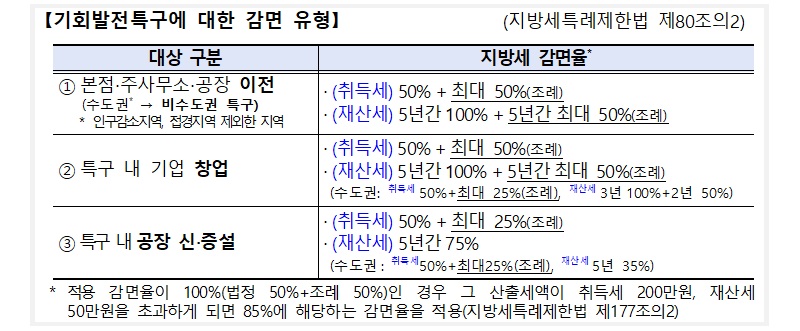 기회발전특구에 대한 감면 유형은 ▲본점·주사무소·공장이 수도권에서 비수도권 특구로 이전하는 경우 ▲특구 내 기업을 창업하는 경우 ▲본점·주사무소 등은 수도권에 두고 특구 내 공장을 신·증설하는 경우 등 3가지다.