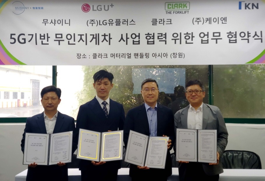 LG유플러스는 글로벌 지게차 제조 기업 클라크 머터리얼 핸들링 아시아(이하 클라크), AI기반 물류 솔루션 업체 무샤이니, 실내 측위 솔루션 업체 케이엔과 '5G 기반 무인지게차 공동 사업 추진'에 관한 업무협약(MOU)을 체결했다고 9일 밝혔다.