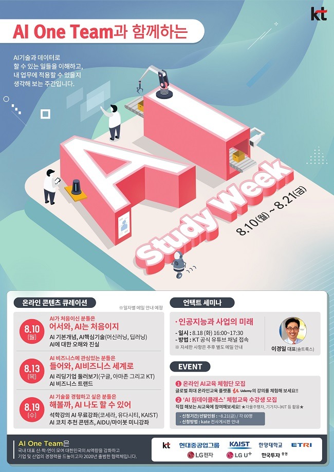 국내 대표 산·학·연 AI 협력체인 AI One Team이 8월 10일부터 21일까지 2주간 ‘AI Study Week’를 개최하고 AI/DT(Digital Transformation)에 대한 관심과 저변확대를 위한 다양한 온라인 학습 영상 콘텐츠를 제공한다고 10일 밝혔다.