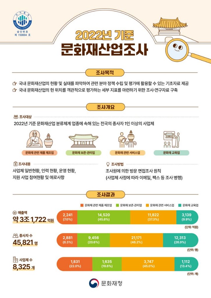 문화재청은 국가유산산업에 대한 현황과 실태를 파악하여 향후 관련 정책수립 및 평가의 기초자료로 활용하고자 전국에 있는 1인 이상 사업체 1,500개를 대상으로 ‘문화재산업조사’(2022년 12월 31일 기준)를 처음 실시한 결과, 문화재산업 전체 매출액은 3조 1,722억 원, 사업체는 8,325개, 종사자는 45,821명인 것으로 확인했다.