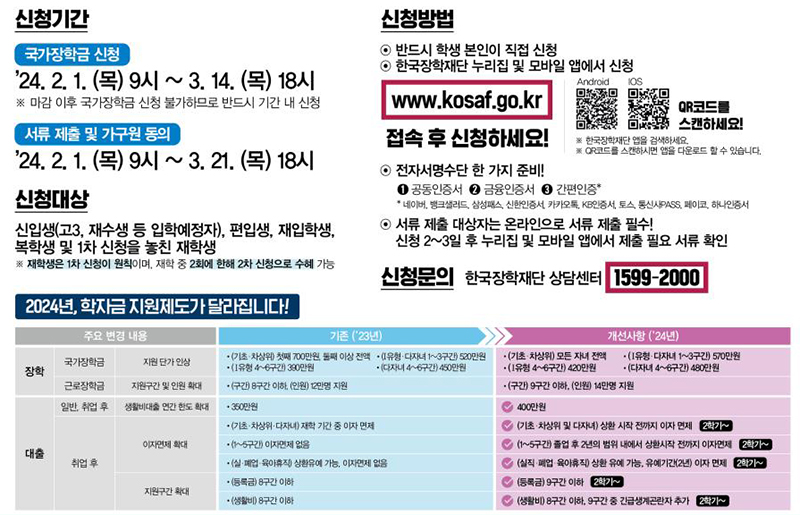 한편 학자금대출 및 관련 내용은 한국장학재단 누리집( https://www.kosaf.go.kr )이나 고객상담센터(1599-2000)로 문의하면 된다.