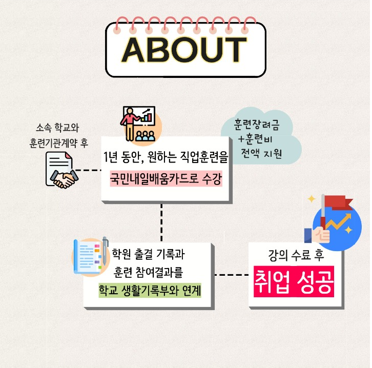 올해는 학생들의 훈련 여건을 개선하고 다양한 진로 탐색 기회를 제공하기 위해 지원을 확대한다. 훈련장려금을 월 11.6만원에서 20만원으로 인상하며, 대학일자리플러스센터와의 연계를 통해 진로상담 등 서비스를 제공한다. 또한, 첨단·디지털 직종에 프로젝트 기반 학습(PBL)을 적용한 신기술과정을 도입한다.