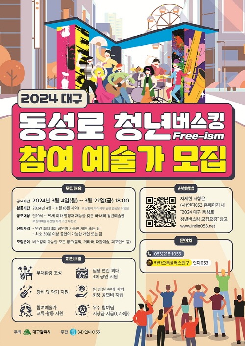 동성로 청년버스킹 참가신청은 3월 22일까지이며, 자세한 사항은 사업 주관단체인 (사)인디053 홈페이지( www.indie053.net )를 통해 확인할 수 있다.
