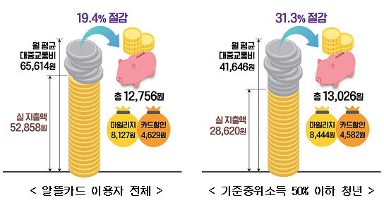 지난 3월부터 알뜰카드 마일리지가 추가로 지급(1회당 100원 ~200원)되는 기준중위소득 50% 이하 청년(19세~34세)들은 매달 평균 2423원의 마일리지를 추가로 지급 받아 월 평균 1만 3026원(마일리지 8444원, 카드할인 4582원), 대중교통비의 31.3%를 절감했다.