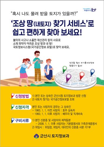 '조상땅 찾기 서비스'는 갑작스러운 조상의 사망이나 재산관리 소홀 등으로 소유 토지내역을 모르는 시민들에게 무료로 본인 명의나 조상 명의의 토지를 찾아주는 서비스다.