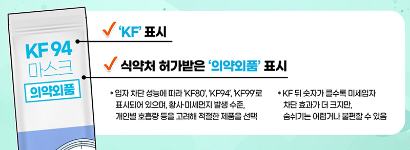 예를 들어 KF80은 평균 0.6㎛ 크기의 미세입자를 80% 이상 걸러낼 수 있으며, KF94와 KF99는 평균 0.4㎛ 크기의 입자를 각각 94%, 99% 이상 걸러낼 수 있다.