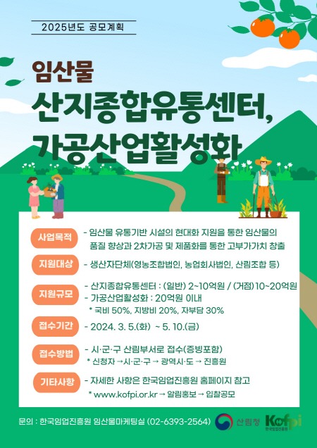 공모사업자로 최종 선정된 영농조합법인, 농업회사법인, 산림조합 등은 사업비를 지원받아 유통·가공 기반 시설을 갖추게 되며, 이를 활용해 임산물 가공·판매의 경쟁력을 갖춰 더욱 높은 소득을 올릴 수 있을 것으로 기대된다.