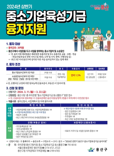 서울 용산구는 금리 인상, 물가 상승 등으로 어려움을 겪고 있는 지역 내 중소기업과 소상공인을 대상으로 중소기업육성기금을 재원으로 총 60억원 규모의 대출을 지원한다.