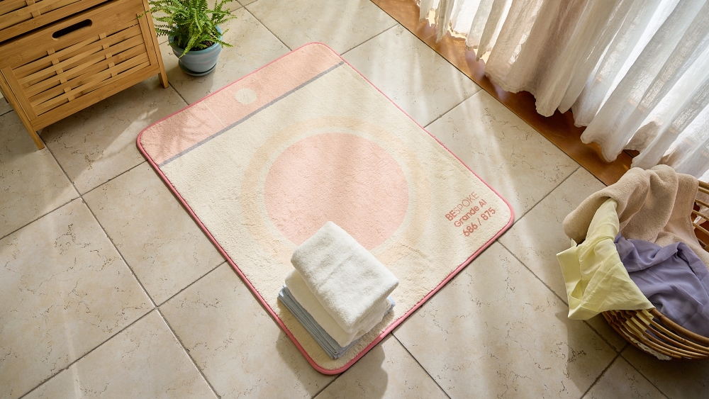 러그는 ▲ ‘ 912/697 ’ (BESPOKE 냉장고 4도어 키친핏) ▲ ‘ 380/406 ’ (BESPOKE 큐브 에어) ▲ ‘ 445/595 ’ (BESPOKE 에어드레서) 등과 같이 제품의 상세 규격이 적혀 있어 실제 공간에 가전을 배치했을 때의 동선이나 구조를 고려해볼 수 있다는 점이 특징이다.