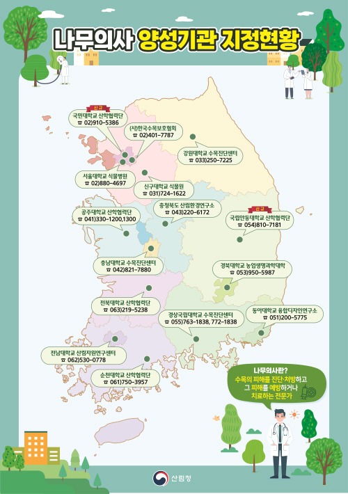 그간 서울지역은 교육수요에 비해 양성교육기관이 부족하고 경북지역은 교육을 받기 위해서는 타지역으로 이동해야 하는 번거로움이 발생해 교육생들의 불편사항을 개선하고자 서울과 경북지역에 각 1개소씩 2개 기관을 나무의사 양성기관으로 추가 지정했다.