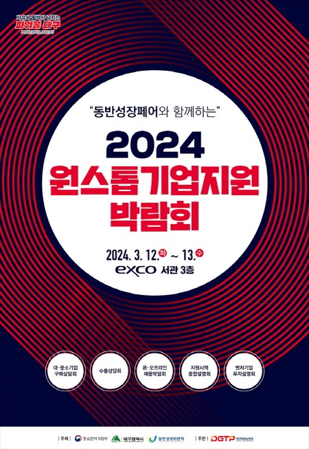 대구광역시는 중소벤처기업부, 동반성장위원회와 함께 오는 3월 12일(화) 오후 2시 엑스코 서관 3층에서 국내 유일의 기업종합지원 비즈니스 행사인 ‘2024 원스톱기업지원박람회’ 개막식을 개최한다.