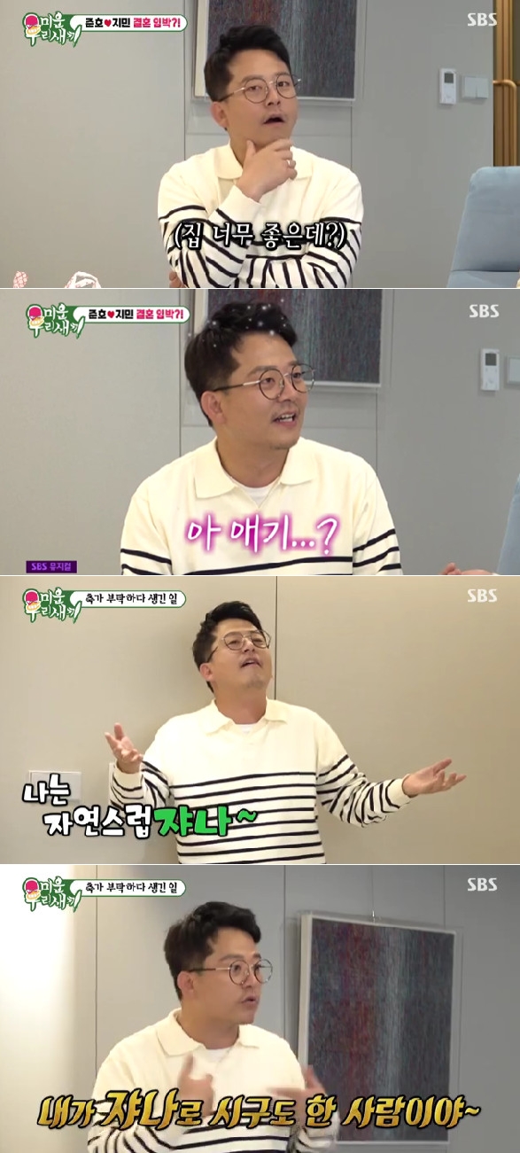 김준호는 김지민이 아이를 예뻐한다는 장동민의 말에 부끄러워하는 모습을 보였고, 이내 결혼하고 싶은 마음을 간접적으로 표현했다.