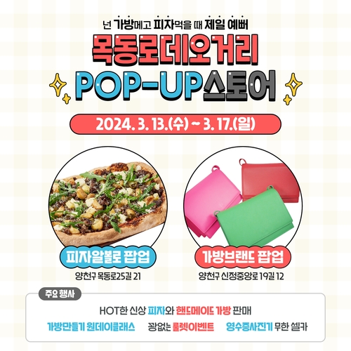 양천구는 3월 13일부터 17일까지 5일간 목동역 인근 목동로데오거리 공실 점포 두 곳을 활용해 피자와 가방을 주제로 로컬브랜드가 참여하는 '체험형 팝업스토어'를 개장한다고 밝혔다.