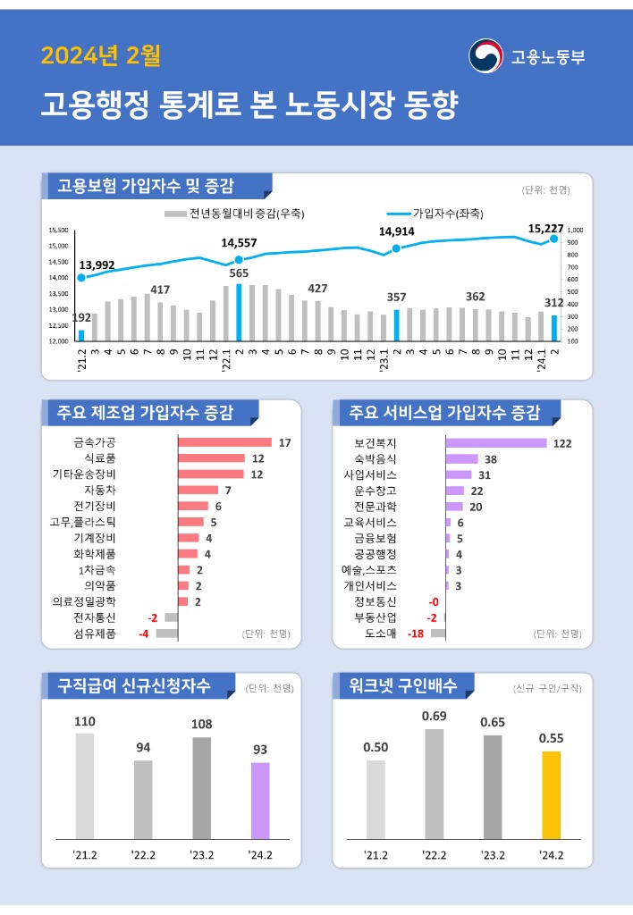 (구직급여) 2월 중 구직급여 신규신청자는 9만 3천명으로 도소매, 제조, 사업시설, 교육서비스 등을 중심으로 전년동월대비 1만 4천명(-13.3%) 감소