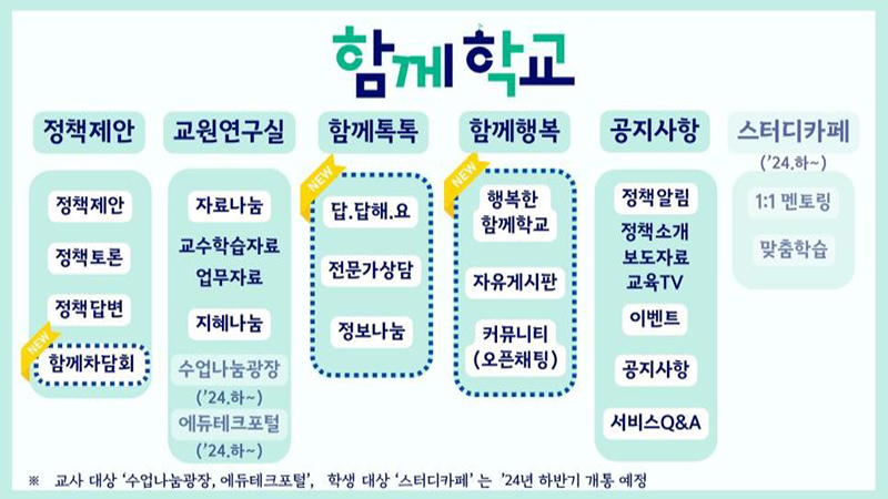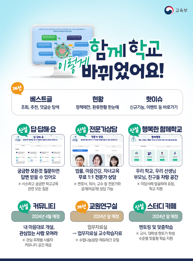 ‘함께학교’는 이번에 교원뿐만 아니라 학부모, 학생에게 도움이 되는 상담, 소통 기능을 신설하고 접근 편의성을 개선해 학생-교원-학부모의 소통을 더욱 활성화하는 데 초점을 뒀다고 교육부는 설명했다.