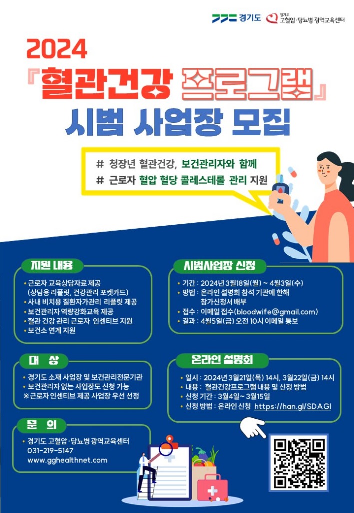 혈관건강 프로그램 운영에 관심 있는 업체를 위해 온라인설명회가 열리며, 이후 혈관건강 프로그램 운영 시범 사업장을 모집할 예정이다. 온라인설명회 참석을 희망하는 업체는 3월 22일까지 온라인으로 신청할 수 있다.