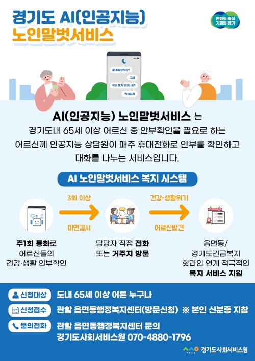 경기도는 지난해 1천 명을 대상으로 진행한 인공지능(AI) 노인말벗서비스를 올해는 5천 명으로 확대한다고 13일 밝혔다.