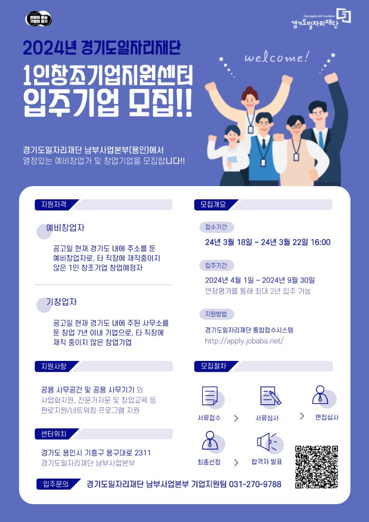 현재 모집 중인 공고를 통해 창업기업으로 선정되면 경기도일자리재단 남부사업본부(용인시 기흥구 소재)에 위치한 공용 사무공간과 사무기기를 무상으로 제공받을 수 있다. 첫 입주 기간은 최초 6개월에서 연장평가를 통해 최대 2년간 입주할 수 있으며, 자금 지원·창업 교육·전문가 자문·관련 네트워크 구축 등 다양한 지원을 무료로 받을 수 있다.