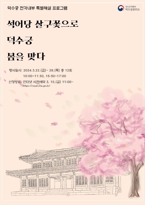 문화재청 궁능유적본부 덕수궁관리소는 봄을 맞아 오는 22일부터 28일까지 매일 2회(오전 10시, 오후 3시 30분) 덕수궁 주요 전각 내부를 관람하며 살구꽃을 감상할 수 있는 특별해설 프로그램을 운영한다.