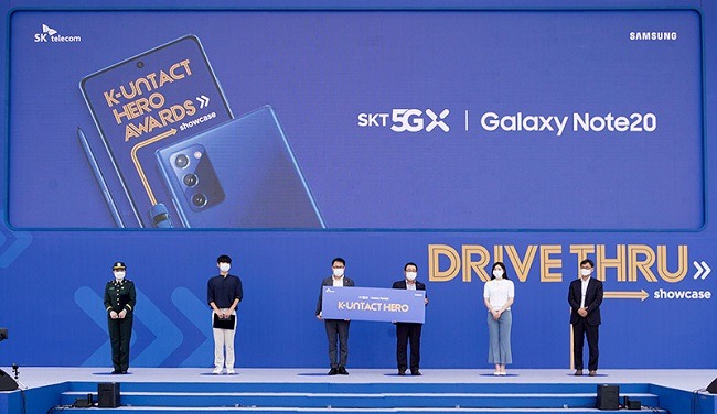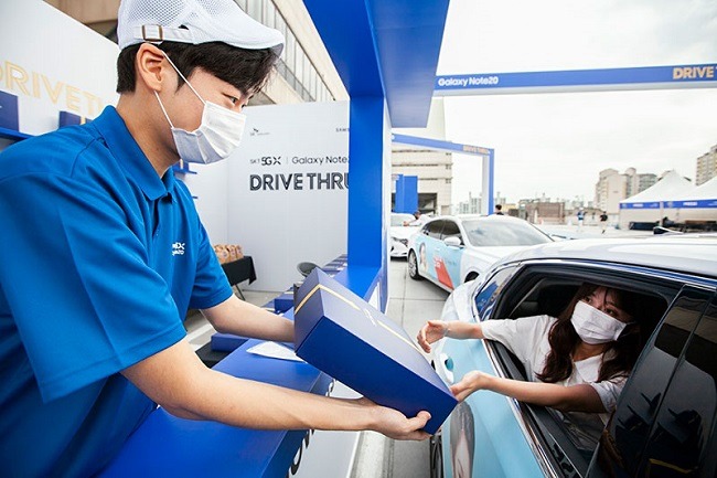 SK텔레콤이 코로나19로 각종 오프라인 행사가 어려움에도 불구하고 노트20 개통일(14일) 전날인 13일 오전 서울 도심 한복판에서 ‘갤럭시 노트20 5G 드라이브 스루(Drive-Thru) 행사’를 진행해 이목을 끌었다.