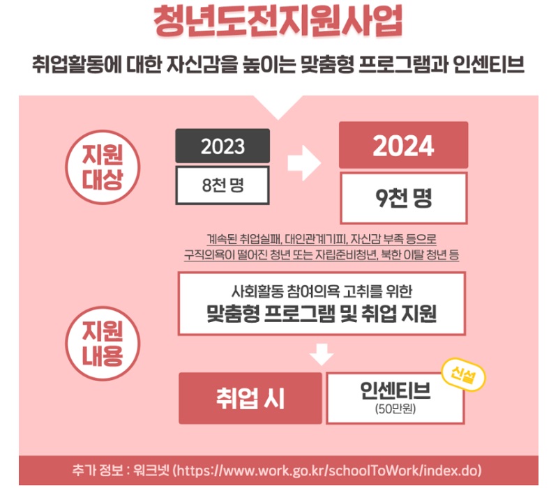 한편 계속된 취업 실패, 대인관계 기피, 자신감 부족 등으로 구직의욕이 떨어진 청년을 대상으로 맞춤형 프로그램을 제공하는 ‘청년도전지원사업’은 8000명에서 9000명으로 확대한다.