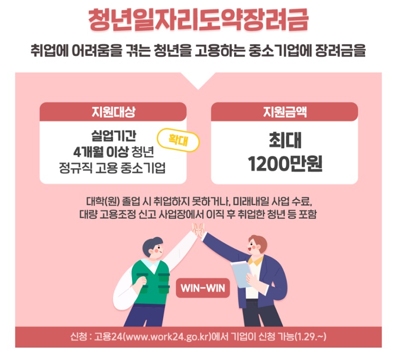한편 올해 청년일자리도약장려금 사업은 지난 1월 29일부터 접수를 시작했는데, 특히 이번 해부터 더 많은 지원을 위해 채용인원을 지난해보다 3만 5000명을 늘린 총 12만 5000명으로 확대했다.
