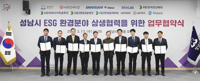 성남시는 3 월 13 일 오후 2 시 시청 2 층 모란관에서 지역 내 9 곳 기업과 ‘ESG 환경분야 상생협력을 위한 업무협약 ’ 을 체결했다 .