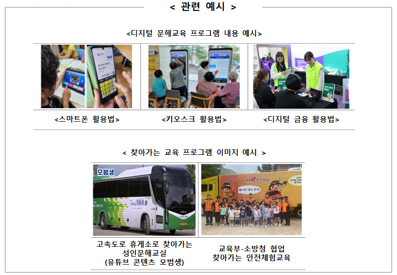 주요 교육 내용은 무인안내기(키오스크) 사용법, 배달·쇼핑앱 이용법 등으로, 고령층이 이를 통해 디지털 일상생활을 편리하게 누리는 데 도움이 될 것으로 기대된다고 교육부는 전했다.
