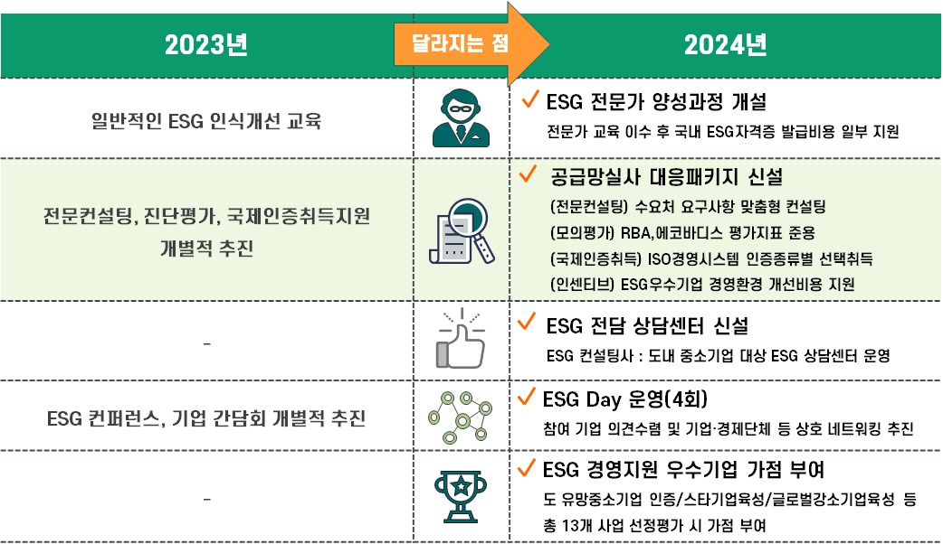 올해 새롭게 개편된 ‘중소기업 ESG경영 지원사업’ 주요 내용은 ▲ESG 사내전문가 양성과정 ▲공급망실사 대응 패키지 ▲ESG 전담 상담센터 ▲ESG 데이(Day) 운영 등이다.