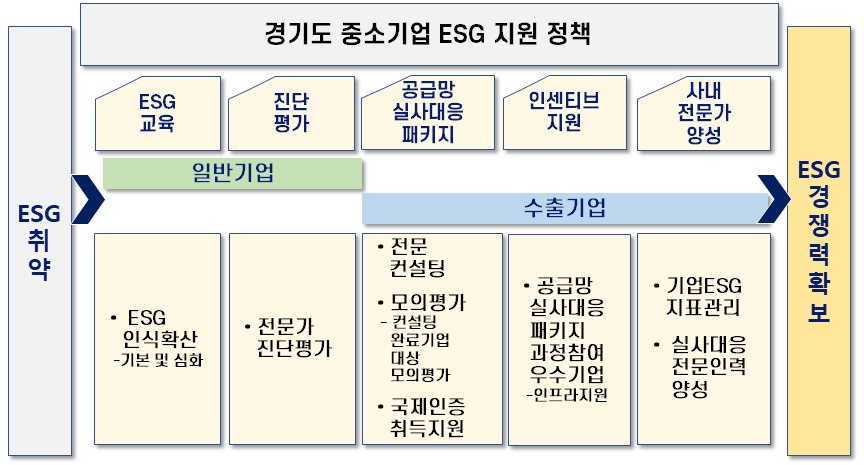 경기도가 중소기업의 ESG(환경·사회·투명)경영 활성화를 위해 추진 중인 ‘중소기업 ESG경영 지원사업’의 지원 항목을 수출 경쟁력 강화, 전담 상담센터 운영 등으로 확대했다.