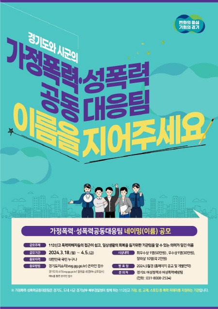 경기도가 3월 18일부터 4월 5일까지 ‘가정폭력·성폭력공동대응팀’ 이름 공모전을 전 국민을 대상으로 연다.