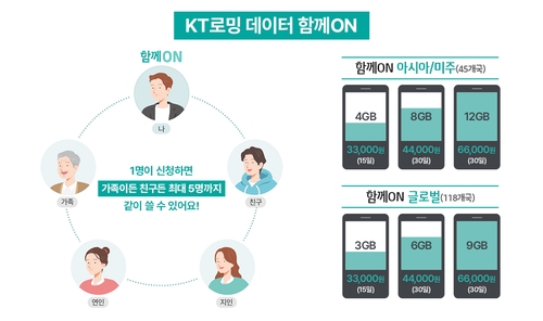 KT가 15일부터 '로밍 데이터 함께ON' 이용 가능 인원을 기존 본인 포함 3명에서 5명까지 대폭 확대하고, '로밍 데이터 함께ON 글로벌' 상품의 기본 데이터 제공량을 최대 50%까지 늘린다고 14일 밝혔다.